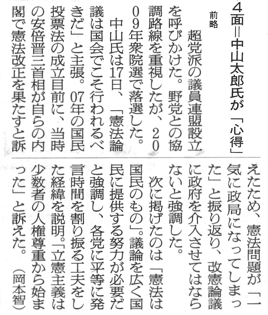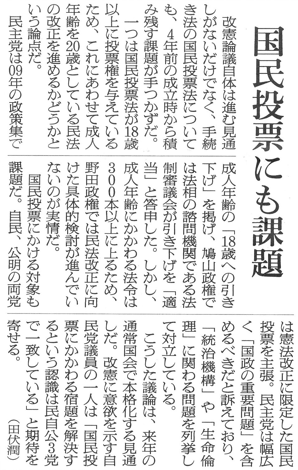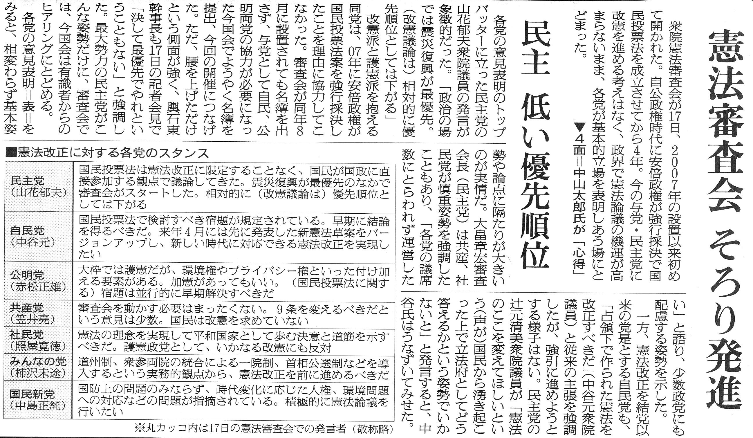 「憲法審査会」そろり発進(2011.11.18.朝日新聞記事)