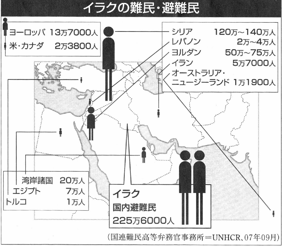 国連の人道問題担当調整官は今年2月、イラク人400万人が飢餓に直面し、国民の4割が安全な水を得ることができず、国内避難民が06年の約2倍の250万人にのぼったと報告しました。