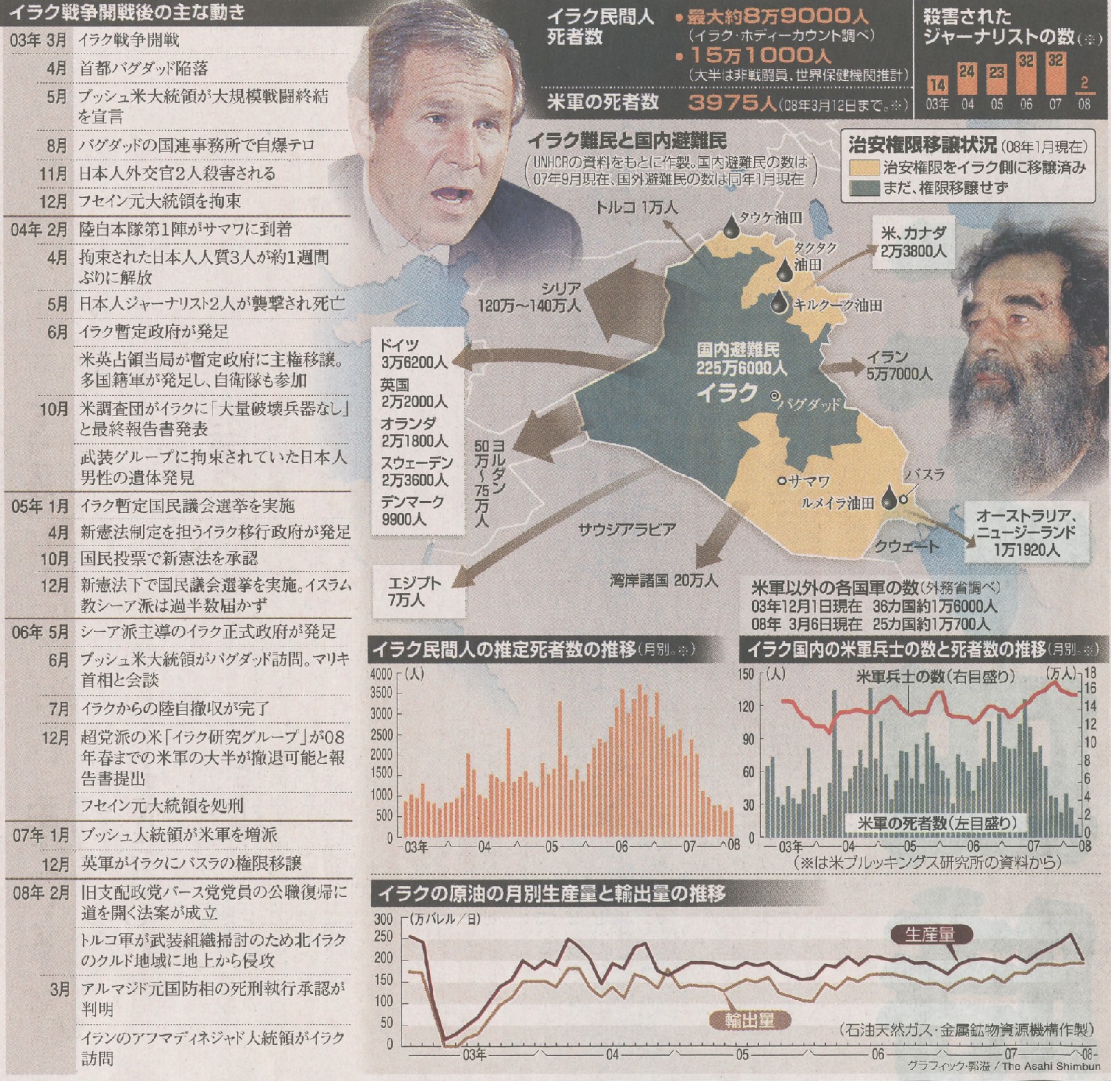イラク国内は、イラク攻撃後に生じた宗派対立に根ざす武装勢力間の抗争がある上に、各武装勢力と多国籍軍との抗争が複雑に絡み合って泥沼化した戦争の状態だ。米軍がこの5年間に13万~16万人もの兵員をイラクに常駐させ、ベトナム戦争を上回る戦費を負担し、双方に多数の死傷者を出しながら、なお十分な治安の回復がなされていない。