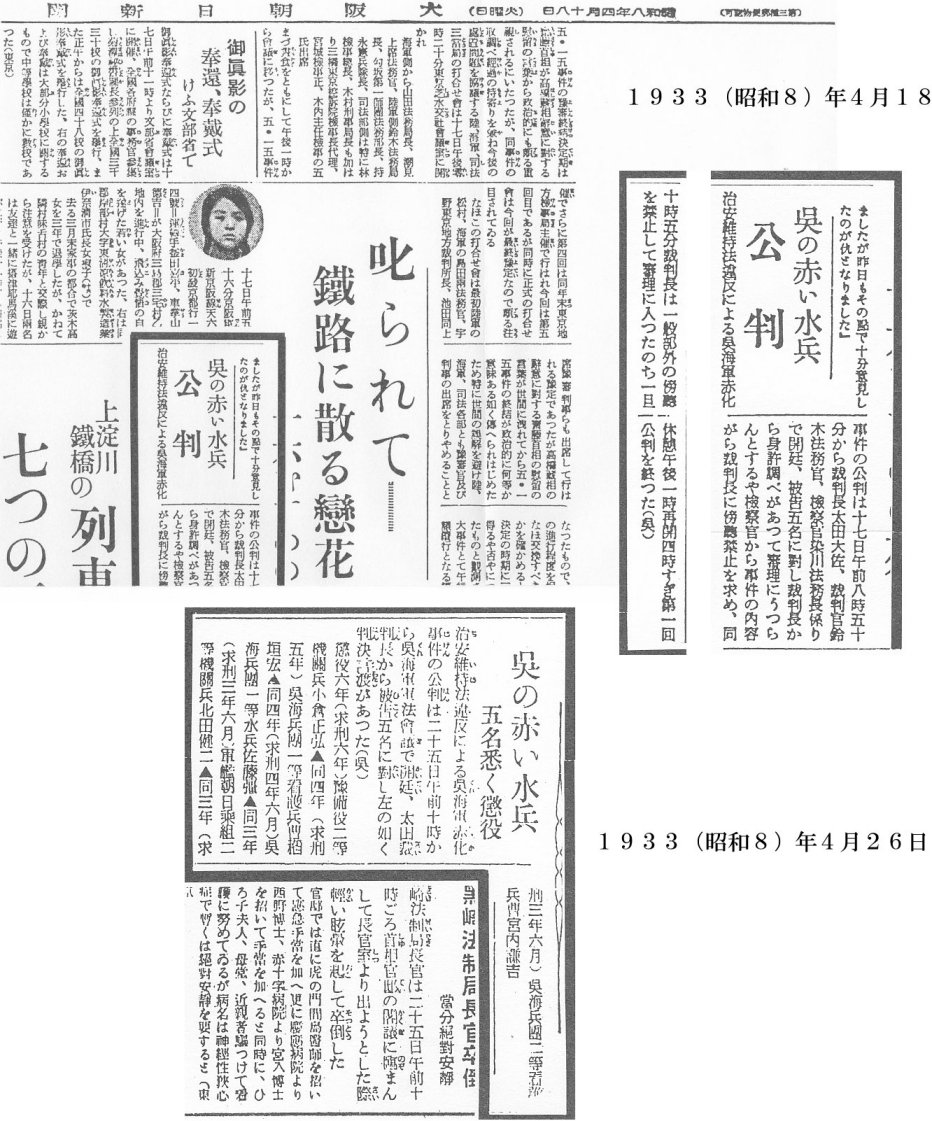 「治安維持法違反による呉海軍赤化事件の公判は17日午前8時50分から裁判長太田大佐、裁判官鈴木法務官、検察官染川法務長係りで開廷、被告5名に對し裁判長から身許調べがあって審理にうつらんとするや検察官から事件の内容がら裁判長に傍聴禁止を求め、同10時5分裁判長は一般部外の傍聴を禁止して審理に入ったのち一旦休憩,午後1時再開4時すぎ第1回公判を終った。(呉)」