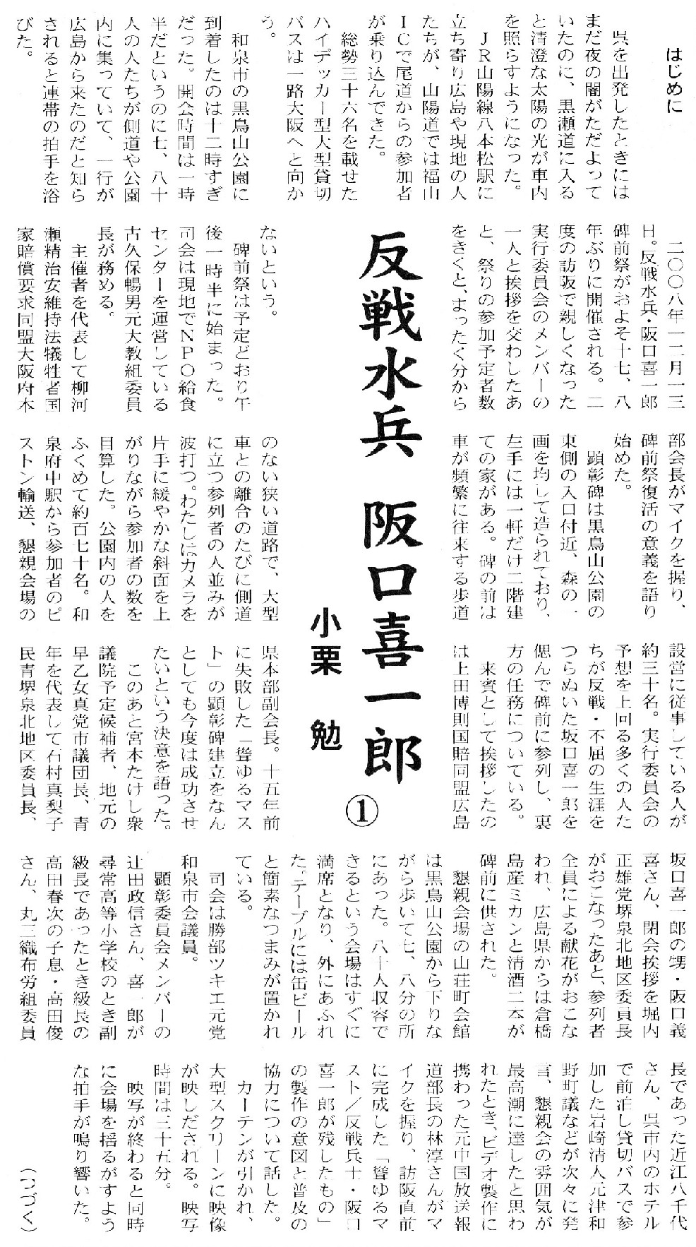 08年12月13日には、[聳ゆるマスト」創刊号の発刊責任者である阪口喜一郎の出身地大阪府和泉市黒鳥町で、