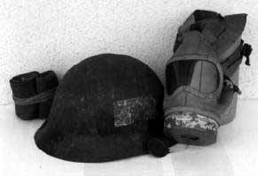 ゲートル.鉄かぶと.防毒マスク警防団に配布された。ゲートルは膝下の脚絆。