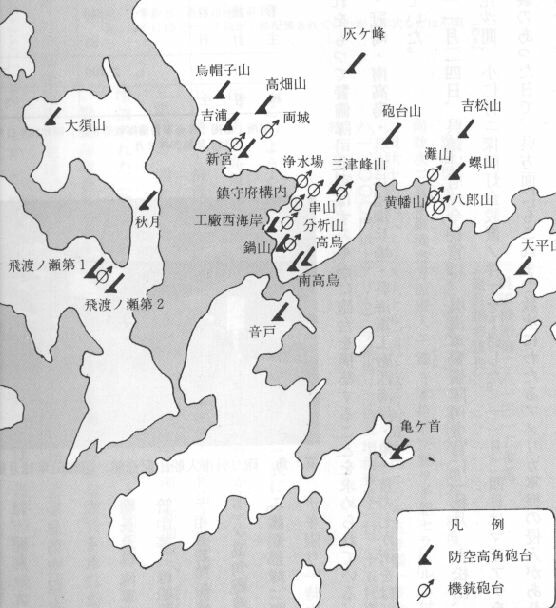 防空高名砲台20ヵ所82門、機銃砲台12ヵ所49基103挺、探照灯台30ヵ所に