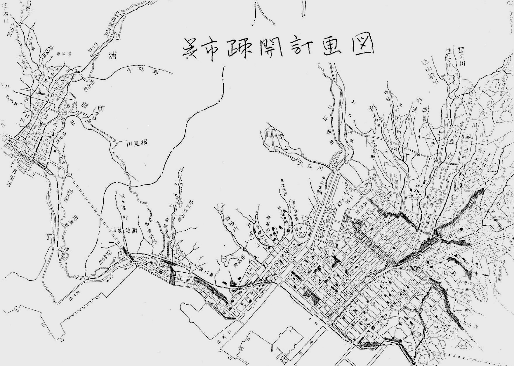 1944年(昭和19)5月、呉市は「重要地域都市」に指定され、消防道路と空き地をつくるため建物疎開が始まった。塩川の両岸や、休山山ろくか二河公園まで丁字型の疎開地がつくられた。