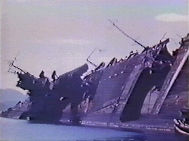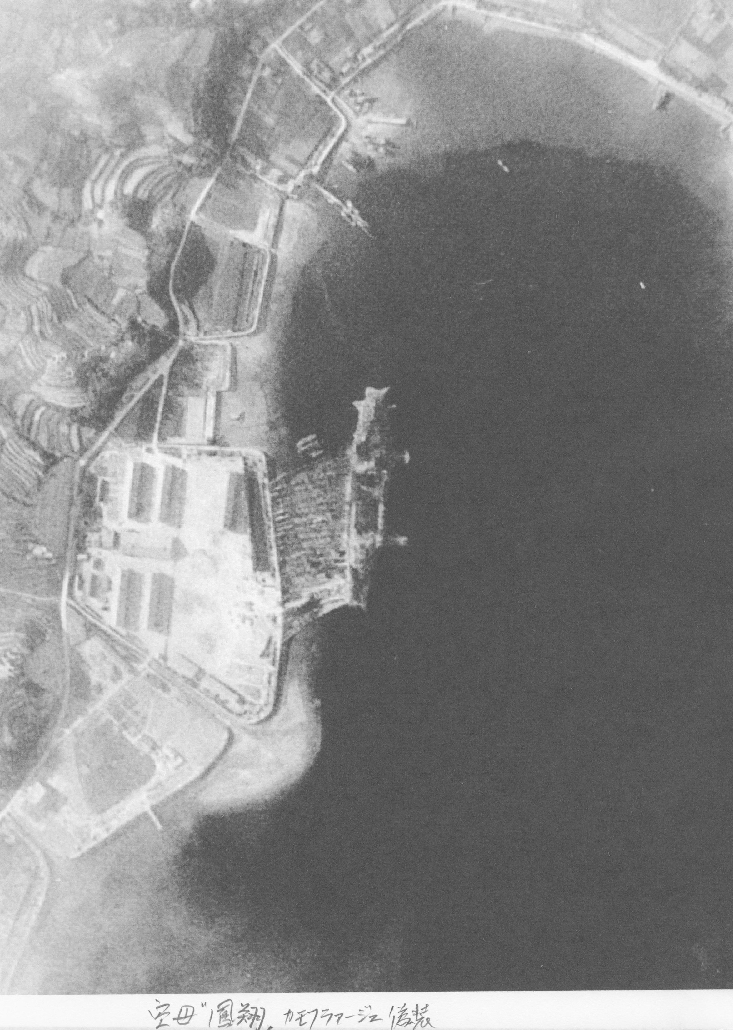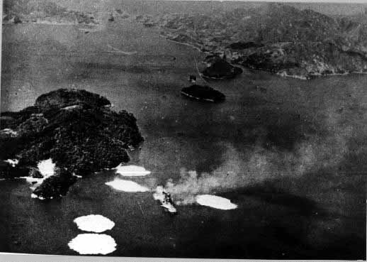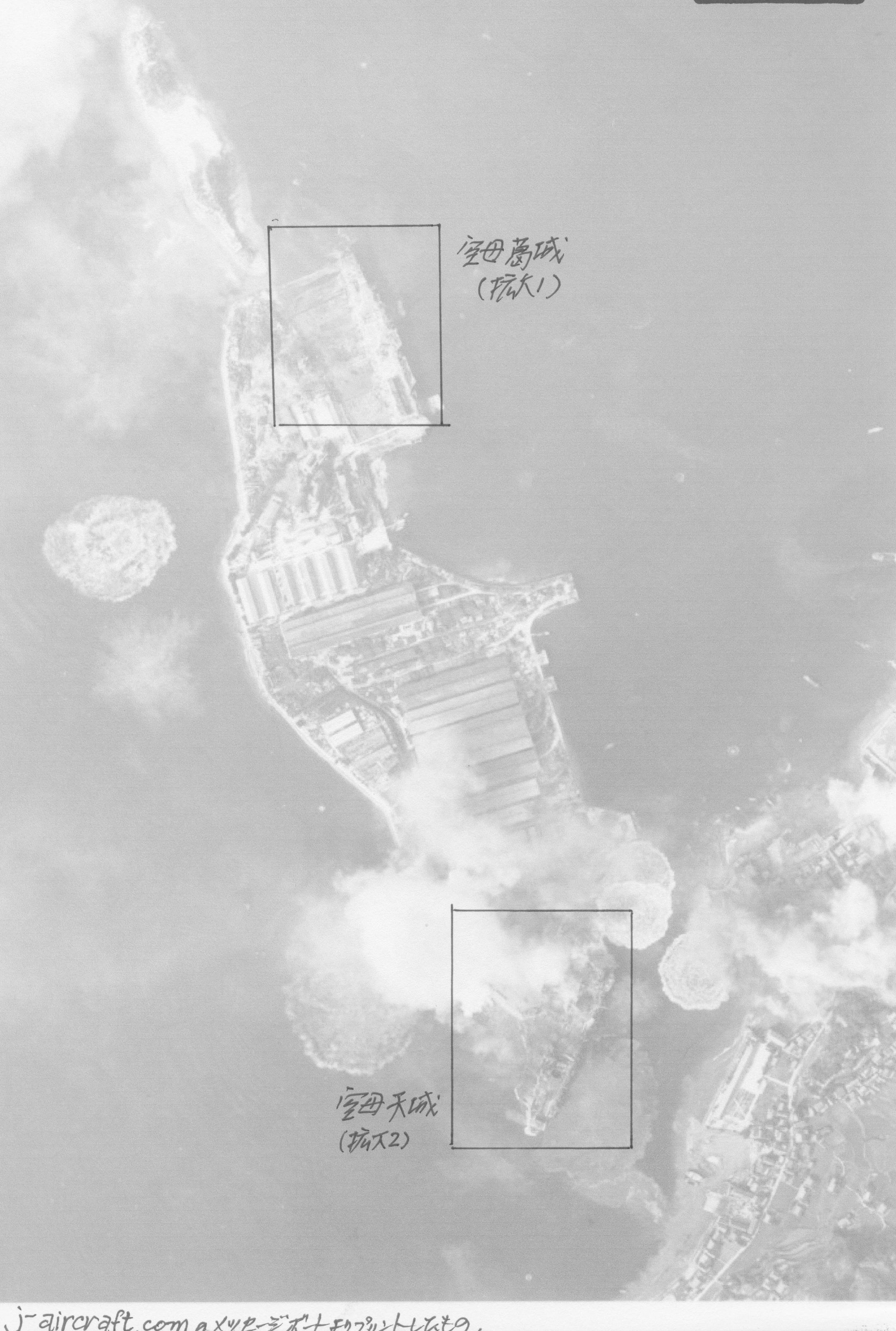 三ツ子島(北部に「葛城」、東側に横転した「天城」)