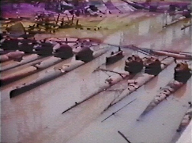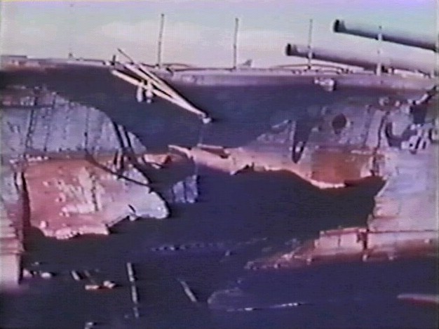 呉湾で動けなくなっていた日本海軍軍艦は必死の抵抗を見せ、猛烈な戦いがくりひろげられましたが、それは一般市民を巻き込んだものでした。 軍艦をねらった爆弾やロケット弾は市民の頭上にも降り注ぎ、逃げまどう人には機銃掃射が浴びせられました。軍艦の対空砲火は市民の住宅にも炸裂しました。呉湾内外は戦場になったのです。