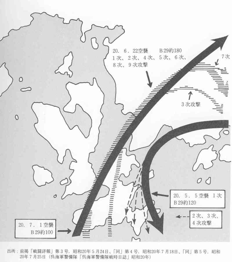 テニアン基山を発進した第58航空団の166機は、硫黄島上空を経て北西進し、高知県足摺岬西方約40キロの沖ノ島(北緯32度43分.東経132度33分)を陸地確認点として、四国西端部をかすめて広島湾沖に向けて北西進し、山口県防予諸島の八島(北緯33度46分.東経132度9分)を進入点とし、攻撃線を北東の方向にある呉市に向け、休山の南西上空に侵入してきた。